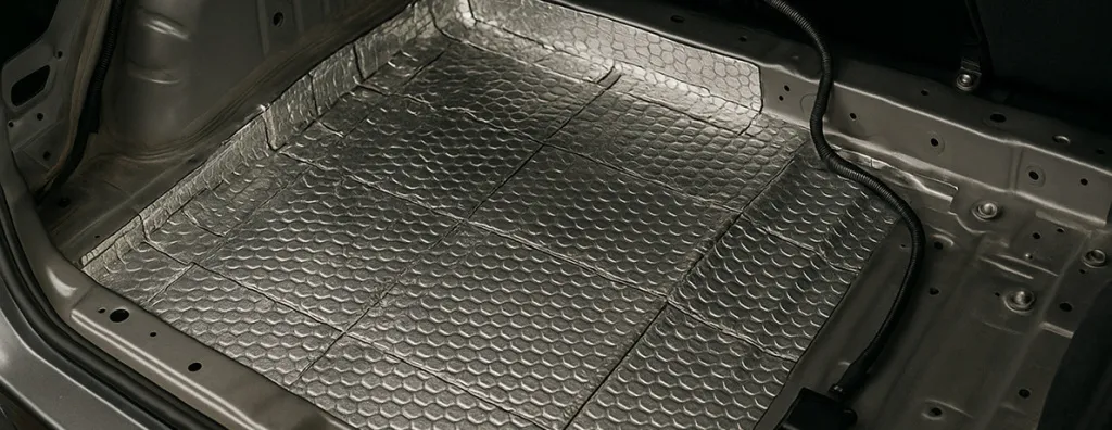 - Серьезный эффект даёт установка шумоизоляции на стенки и крышку багажника. Особенность — работы по монтажу выполнять несложно.